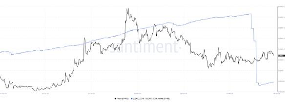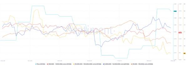 就鲸鱼行为而言,持有 100 万至 1000 万个 SHIB 的群体通常会在局部顶部或 meme 币的看涨事件期间通过下跌和减持来积累。