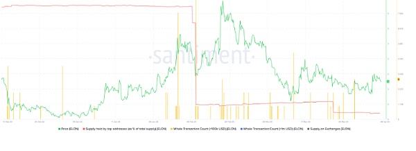 在 ELON 价格达到当地最高点时,超过 100,000 美元的鲸鱼交易数量增加,这与其 meme 硬币竞争对手(其他柴犬主题代币)中观察到的趋势相似。