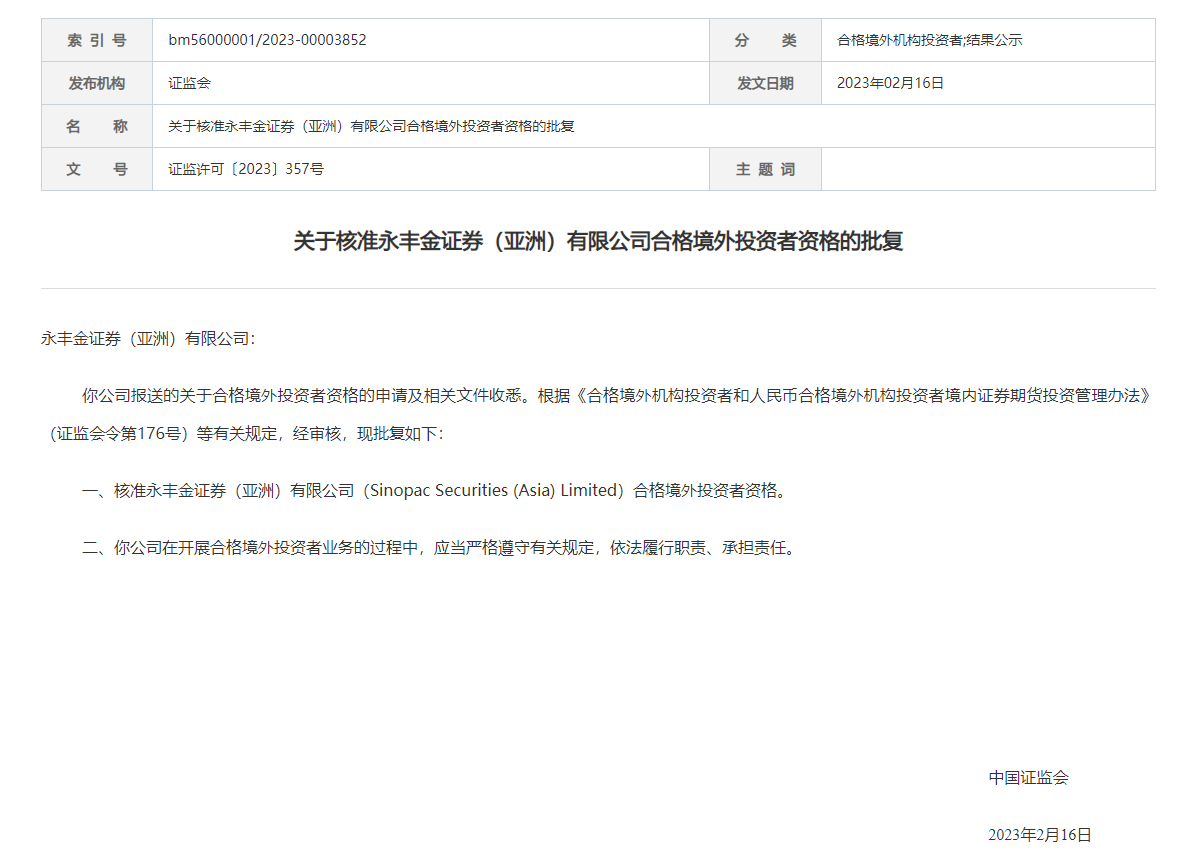 永丰金证券(亚洲)有限公司成立于1994年,经香港证券及期货事务监察委员会核准从事证券交易、期货合同交易、就证券提供意见、就期货合同提供意见及提供资产管理各项受规管业务。并在今年的2月16日获得中国证监会批准,获得合格境外机构投资者资格,可以在大陆地区使用来自境外的资金进行境内证券期货投资。