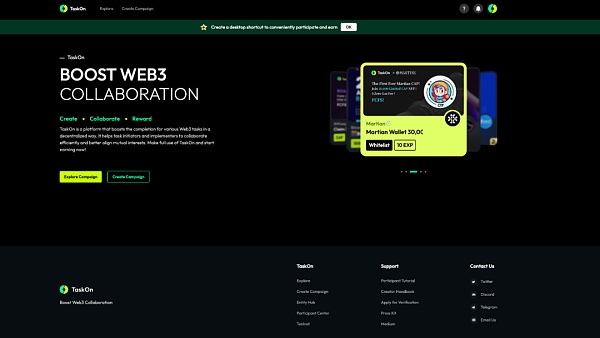 TaskOn 是一个 Web3 任务协作平台,致力于 Web3 项目的营销和运营增长。它使您能够轻松地开展活动来推广您的品牌、获得新的真实用户、发展您的社区、提高销量、铸造 NFT 或管理白名单。