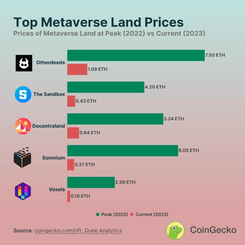 这五款游戏分别是Otherdeed for Otherside、The Sandbox、Decentraland、Somnium Space和Voxels Metaverse。根据CoinGecko的分析,元宇宙的地价已经回落到0.37ETH至1.09ETH之间,价格因项目而异。其中最便宜的是Voxels的0.16ETH。