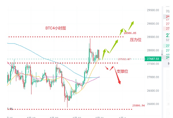 大饼截至发稿前高点28000附近,低点26580附近。日内整体波动不大,昨日文给的多单也有几百点的获利。大饼在一举冲破28000后,出现大幅的获利盘及前期的套牢盘抛售,最终在27500一线受到强支撑。目前市场资金依然在多空博弈中,都在等待周三的债务上限投票,投票要是能够顺利通过,多头将会借机重启,如果没能通过,导致美债出现违约,那将会对风险造成市场不利。目前比特币依然在28000一带反复,若能有效站上28000就有机会去上攻30000。