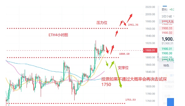 以太坊截至发稿前高点1917附近,低点1880附近,昨日文给的多单也有30多点的获利。以太走势相对强势一些,在冲破1900关口后,最终在1880一线受到强支撑,目前仍在1900一带反复,市场资金都在静待债务上限投票,在投票前预计继续走震荡。