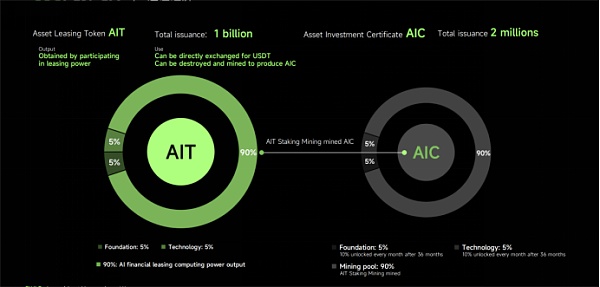 用户通过租赁算力获得AIT通证,可直接兑换USDT获得AI理财收益,或参与销毁挖矿产出AIC通证获得更高收益,用户手中持有的AIT通证和AIC通证,其价值还会随着平台的成长提升,越早期投入的用户可以预期越高的收益。将AI算法产生的收益应用与双通证经济学结合,进而将收益分发到投资用户手上,降低了投资门槛,同时也显著提升了用户收益。