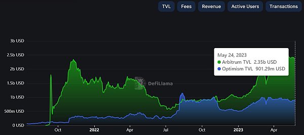 Arbitrum 的 TVL 是 Optimism 的大约 2.5 倍。