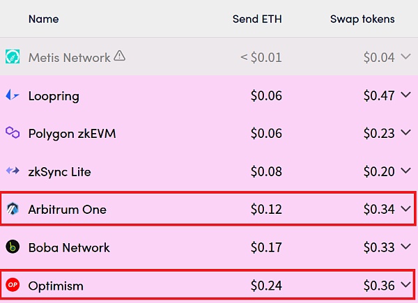 在 Arbitrum 上发送 ETH 的成本是 Optimism 的一半,其中代币交换的成本大致相同。