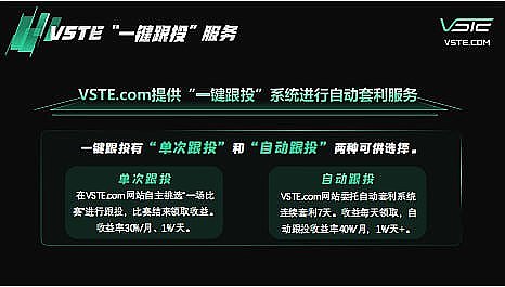 为了让普通大众也能参与赛事套利,VSTE为用户提供了简单快捷的一键跟投服务。用户无需学习专业的套利技能,只需一键操作即可轻松套利。