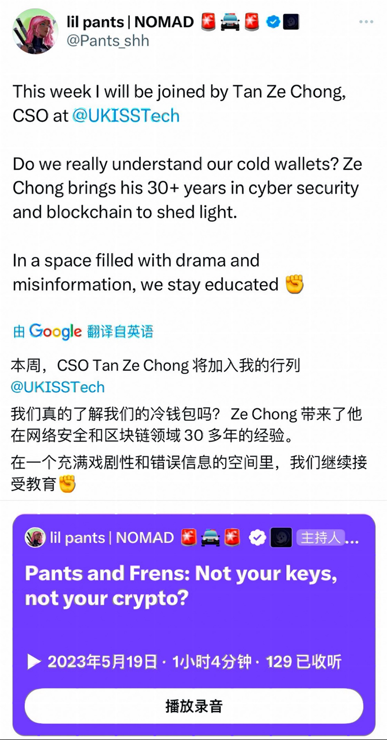 (5月中下旬,UKISS首席战略官Tan Ze Chong受知名KOL lil pants | NOMAD邀请,在其Space中,针对冷钱包安全性和区块链产业的发展进行了讨论)