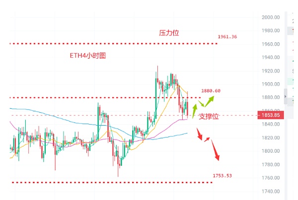 以太坊昨日高点1907附近,低点1845附近,昨日以太联动大饼走出一波下跌,直接跌破1880支撑,随后在1870一带反复,在早间向上冲了一波,但是并没有有效站上1880上方, 说明多头力量不足,若不能有效站上1880上方,则有可能再次去试探箱体下沿1750一线。