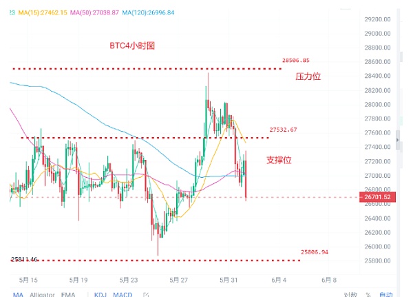 月线级别收出小阴线,MCAD背离并未结束,结合4月收出的十字星来看,本月继续上攻30000一线难度加大。4小时级别布林带平行运行,受布林下轨26800支撑,MCAD温和放量,操作上可以低多为主,高空为辅。建议回踩26500不破轻仓做多,目标27000-27500。28200附近轻仓空,目标27500,止损各350点。行情变化万千,具体操作以实时策略为主。