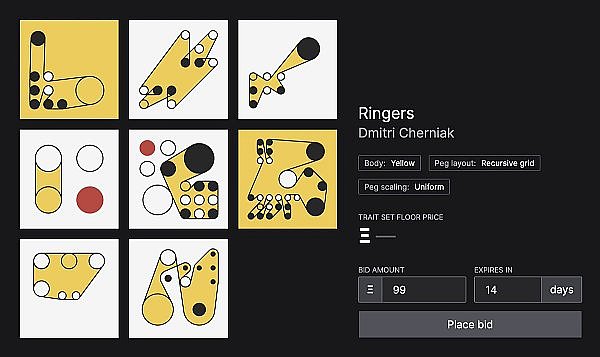 苏富比将于6月15日举行三箭资本NFT藏品的第二次拍卖,本次拍卖将出售 Dmitri Cherniak、Tyler Hobbs、Jeff Davis等艺术家的37件作品。本次拍卖的 NFT 的亮点包括Cherniak的 Ringers#879,该藏品于2021年8月被三箭资本联合创始人Su Zhu和 Kyle Davies以1800 ETH的价格收购,彼时价值约 580万美元。