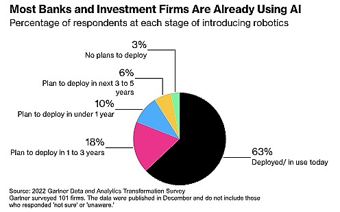 63%的银行和投行已经在使用AI,投行正在大量招聘AI相关的岗位,摩根大通发出3651则招聘;金融服务企业表示,AI提高客户服务的提升作用最明显,高达46%。