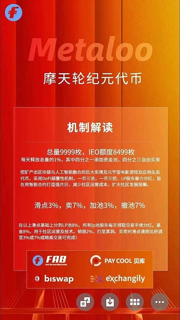 摩天轮纪元代币:总量为9999个,其中lEO额度8499枚。IEO代币每天释放总量的1%给各个IEO持币人,其中四分之一将添加至资金池,为生态系统的可持续发展提供支持,而剩下的四分之三则可供自由买卖。这种代币机制的设计,确保了代币的流动性和市场的稳定性。