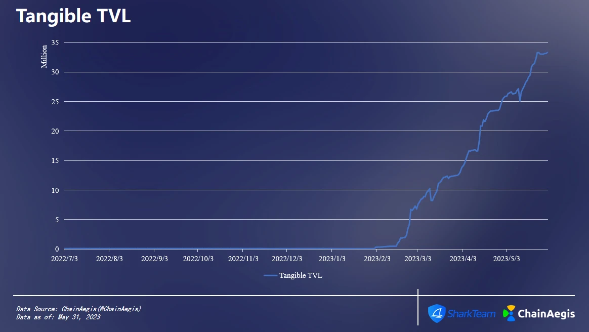 Tangible上线后一直表现平平,直至今年2月3日,其TVL开始持续增长。截止到5月31日,达3331.68万美元,相较于2月上涨了370.95倍。