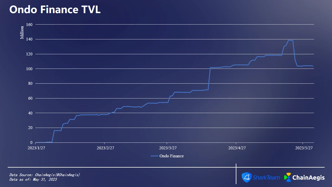 Ondo Finance于今年1月上线链上债券,5月20日,TVL创历史新高,达1.38亿美元,此后略有下降。截至5月31日,TVL为1.03亿美元。