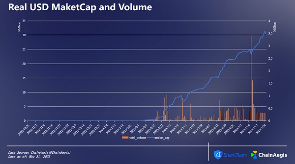 2023年2月起,USDR的市值与交易量均呈现大幅增长的趋势。5月12日,交易量达341.74万美元,创上线以来历史新高,当日TVL为2319.73万美元。5月30日,TVL达历史顶峰,为3136.44万美元,短短半月,TVL涨幅达35.2%。