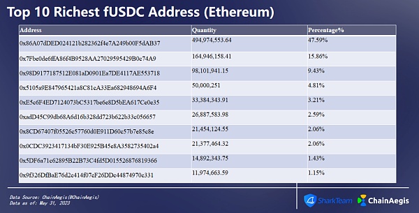 SharkTeam对以太坊上fUSDC Top10持币者进行统计如下,其中top3地址持币总量占比72.88%。