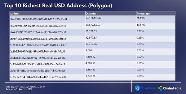 截至6月1日,USDR在Polygon链上发行,共有251个持有者。其中,地址0xa1...3e1f持币量为1747.1万枚,占比55.8%,位居第一;地址0xaf...4d4b持币量为1367.2万枚,占比43.67%,位居第二;二者总占比高达99.47%。