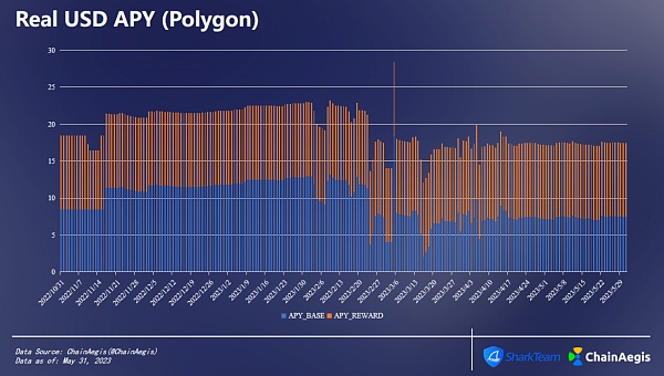 下图为USDR在Polygon链上的APY变化情况。年利率(Annual Percentage Yield,APY)指的是一年复利(利息+本金)所赚取的金额。可以看到,当前APY较上线初期总体变化不大,略有下降趋势,下降了5.78%。