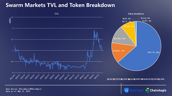自今年以来,Swarm Markets TVL一路上涨,4月5日,TVL达历史新高,为192.67万美元,后呈现下降趋势。截止到2023年5月31日,Swarm Markets TVL为93.3万美元,其中64%由SMT提供,14%来源于WETH,稳定币USDC与DAI分别占比12%,9%。
