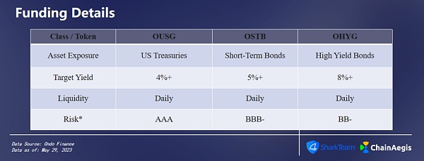 2023年1月,Ondo Finance宣布推出代币化基金,为用户提供链上投资美国国债和机构级债券的机会。据了解,Ondo Finance是通过由资管机构Blackrock和PIMCO等管理的大型、高流动性ETF,推出了三种代币:美国政府债券基金(OUSG)、短期投资级债券基金(OSTB)以及高收益公司债券基金(OHYG)。Ondo Finance将收取按年化计算的0.15%(每月0.0125%)的管理费,这些费用在基金的产品页面上均可以找到。