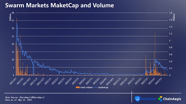 2021年8月8日,Swarm Markets刚刚上线不久,市值升至3337.78万美元,当日其交易量为84.25万美元,较前一日(交易量历史最高164.93万美元)下降了122.62%。此后链上数据表现平平,整个2022年TVL均值为128.0万美元,交易量均值为1192.39万美元。2023年3月起,市场略有起色,4月6日,当日交易量为120.76万美元,TVL达1051.34万美元,为近一年来历史新高。