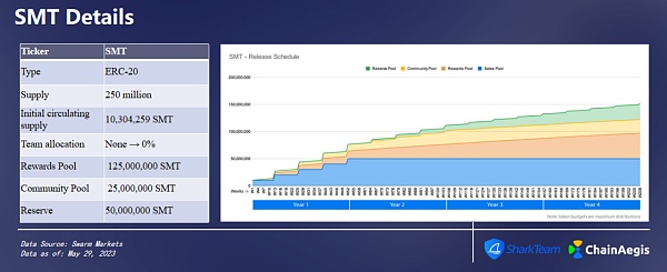 SMT供应总量为2.5亿,其中50%分配给奖励池,10%分配给社区池,20%留作将来使用,预期5年线性释放。