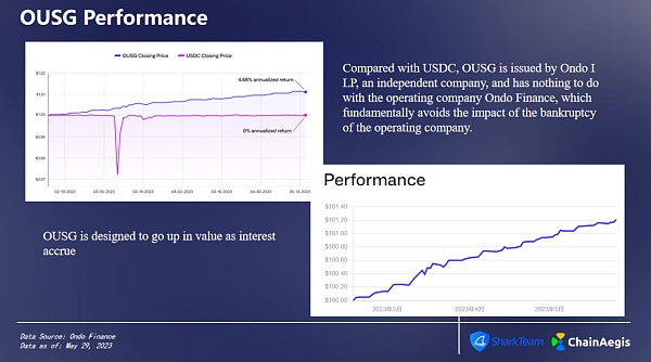 作为国债基金的OUSG旨在随着利息的增加而升值,截止到5月29日,其代币价格为$96.83。