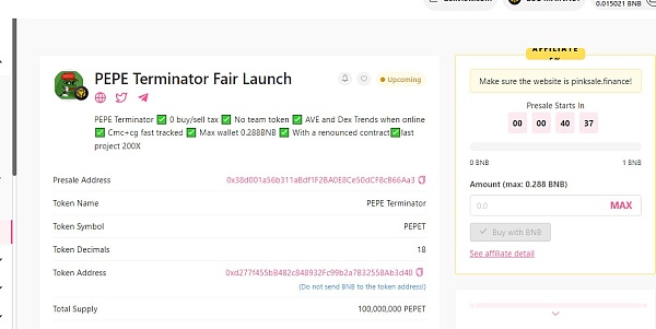 PEPE终结者,他是以一种超募的形式在粉红上面发布,1BNB超募形式。这一次的生态规划会比上一次更加的吸引玩家,结合了很多Web3.0很多的元素在里面。PEPE终结者项目生态规划如下:1. AVE(热搜和图标)2. DEX (热搜和图标)3. 完成审计4. 推特大V合作5: 趋势上线6. 国内外电报宣发PEPE终结者PEPE终结者项目信息:代币名称:PEPET税费:0%税费Max:0.288BNB 链:BSCTG: @pepetoffice