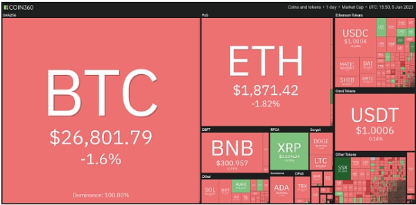 比特币价格在 6 月 5 日触及 60 天低点 25,744 美元,因为交易员担心价格可能会进一步下跌,并指出在美国证券交易委员会的消息成为头条新闻之前,比特币价格已经在 26,600 美元的阻力位上挣扎。