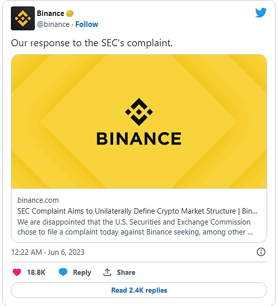 在 SEC 的投诉公开后不久,Binance 在 Twitter 上发布了对诉讼的官方回应。