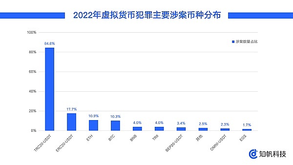 从2022年刑事案件涉及的虚拟货币种类来看,如图二所示,主要包括USDT、ETH、BTC等。其中USDT(泰达币)涉案比例最高,占据了绝对主力位置。