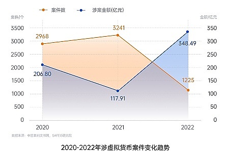 近年来涉及虚拟货币的刑事案件不断增多,由此也使得涉案财产中虚拟货币的占比大幅增加。比如,根据《2022年涉虚拟币犯罪研究报告》结合案件数量和涉案金额来看,如图一所示,虽然相较于2021年,2022年案件数量从3241起降至1225起,减少62%,但总涉案金额却从117.91亿人民币涨至348.49亿人民币,增长近3倍。平均涉案金额从364万人民币涨至2,845万人民币,增长超7.8倍。涉虚拟货币案件的组织化、规模化特征越来越明显。