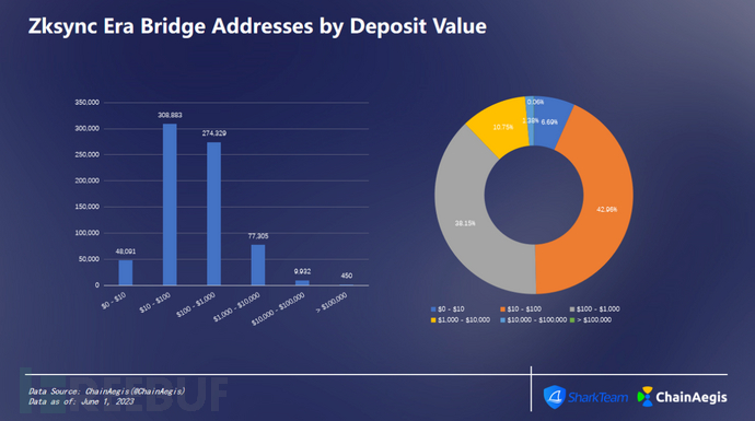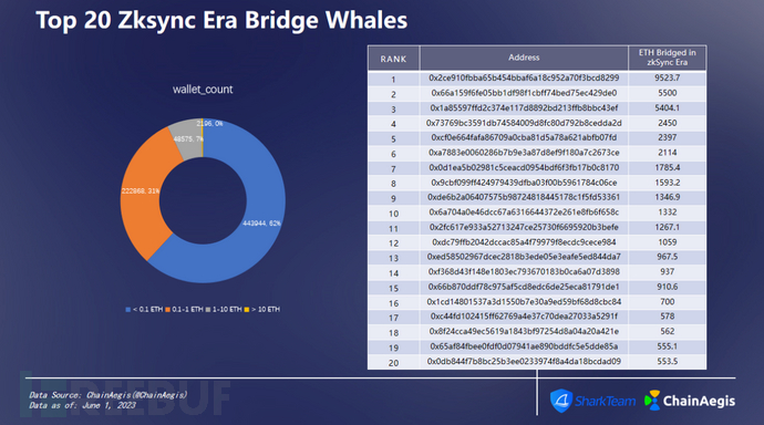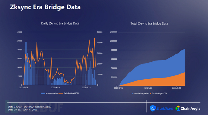Zksync Era官方桥支持从以太坊主网跨到Zksync Era,并且允许任何ERC 20的代币进行转化。5月31日,当日跨链桥转移ETH数量为10,576.76枚,达到高峰。截止到6月1日,从ETH跨链到Zksync Era的ETH总数达到30多万个,平均每个地址0.42枚ETH。