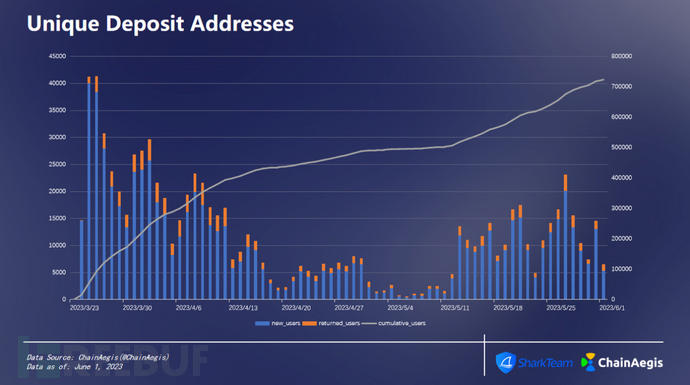 6月2日,Zksync Era存款地址总数为72.3万个。其中与Arbitrum和Optimism都进行过交互的地址数为309,471,占比42.8%,未与之进行过交互的地址数为24,219,占比3.35%。3月25日,当日存款地址数达41,341,达到高峰,3月底交易活跃。在每日存款地址数中,新老地址比为4:1。大多数地址只进行一次交易,重复交易的地址数较少。