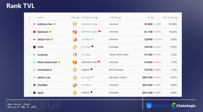 5月31日,Zksync Era生态总TVL达到3.5亿美元,占Layer 2所有项目TVL总和的3.95%,排名第3。尽管与Arbitrum和Optimism相比还有较大的差距,但Zksync Era上线仅2个月,TVL增速很快,值得关注。