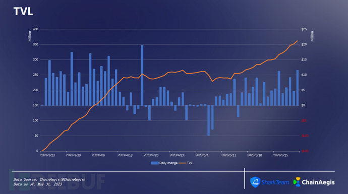 3月24日Zksync Era主网向所有人开放,到4月14日,20天的时间,TVL达到2.41亿美元,平均每天增加1000万美元。4月15日,TVL与前一天相比减少了152万美元,开始震荡,5月17日之后,TVL重新开始逐步攀升,5月31日,Zksync Era的TVL达到3.61亿美元。