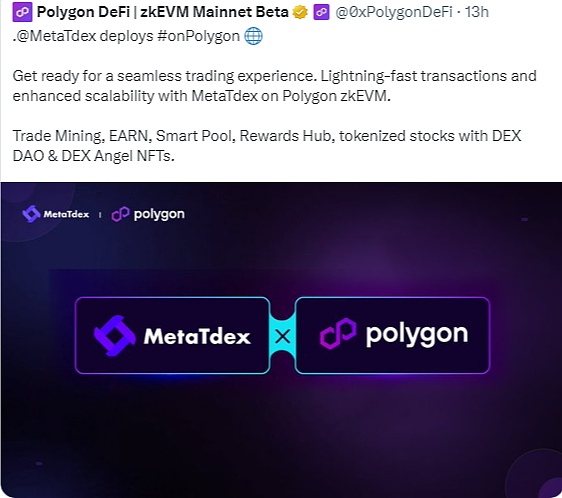 MetaTdex与Polygon战略合作 商讨在Polygon zkEVM上部署的可能性