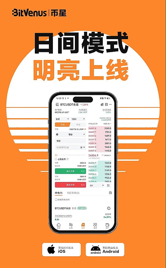 6月5日,BitVenus币星 APP (安卓&iOS)迎来了令人期待的全新升级!为了满足用户的需求,提升使用体验,推出了日间模式,让您在交易中享受更清晰、更舒适的界面体验。
