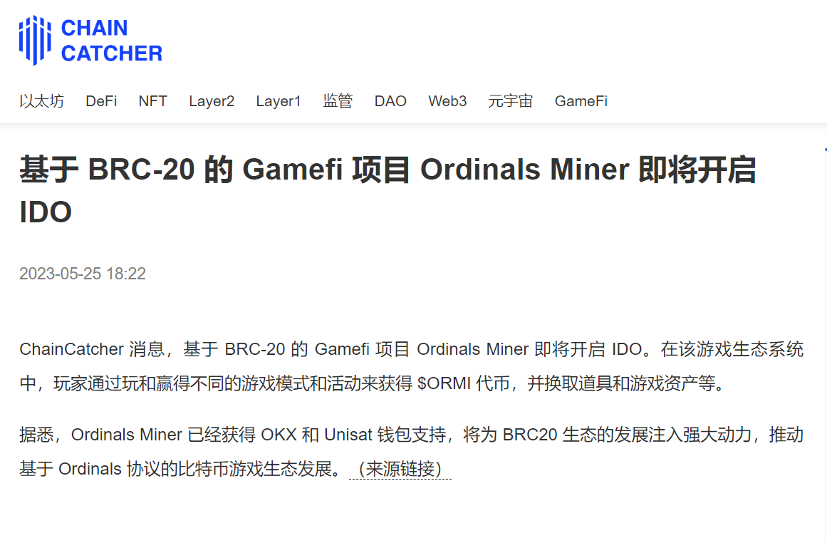Ordinals Miner是第一个创新的Gamefi部署在BRC-20使用Ordinals协议来挖掘BRC20隐藏宝藏的链游。也是第一个带有实用程序的BRC-20令牌,$ORMI令牌为整个Ordinals矿工游戏生态系统提供动力。玩家通过玩和赢得不同的游戏模式和活动来获得代币,可以用代币换取道具和游戏资产等。