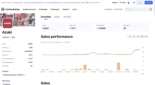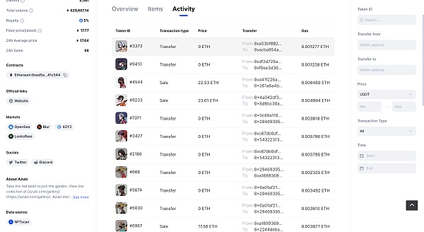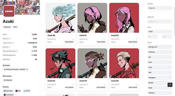 此外,通过 CoinMarketCap 还可以查看任意一个 NFT Collection 的详细资料和信息,每一个 NFT Collection 都有自己的公共主页,用户可以像查询 token 资产详情那样获取任意一个 NFT Collection 的基础资料和信息,以及每一个 NFT item 的详细信息,以及历史所有的交易数据。
