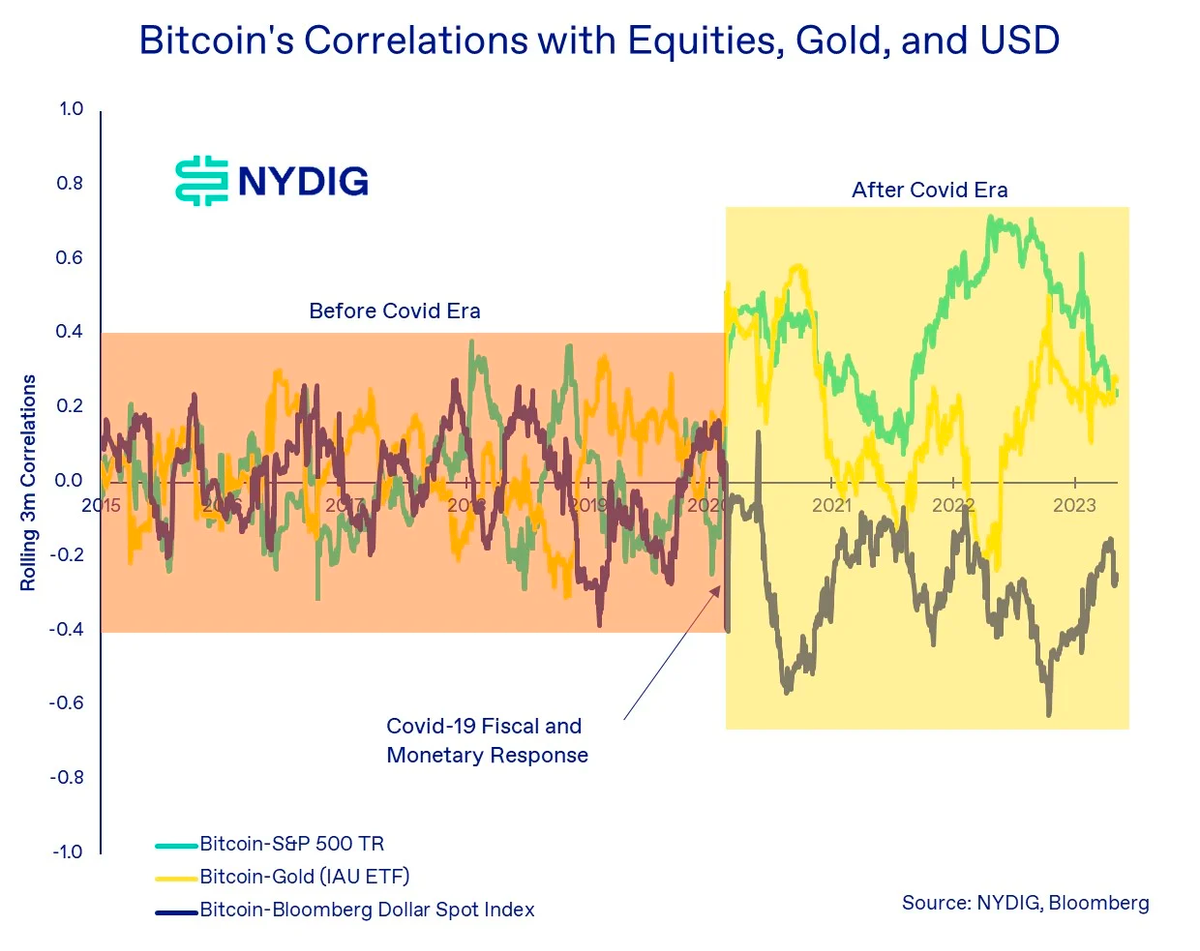 不止是比特币与股票的相关性发生了变化,它与大多数其他资产类别的相关性也出现了变化。下图说明了比特币与股票、黄金、美元相关性的变化,我们可以发现,高点更高、低点更低、绝对平均值也更高。