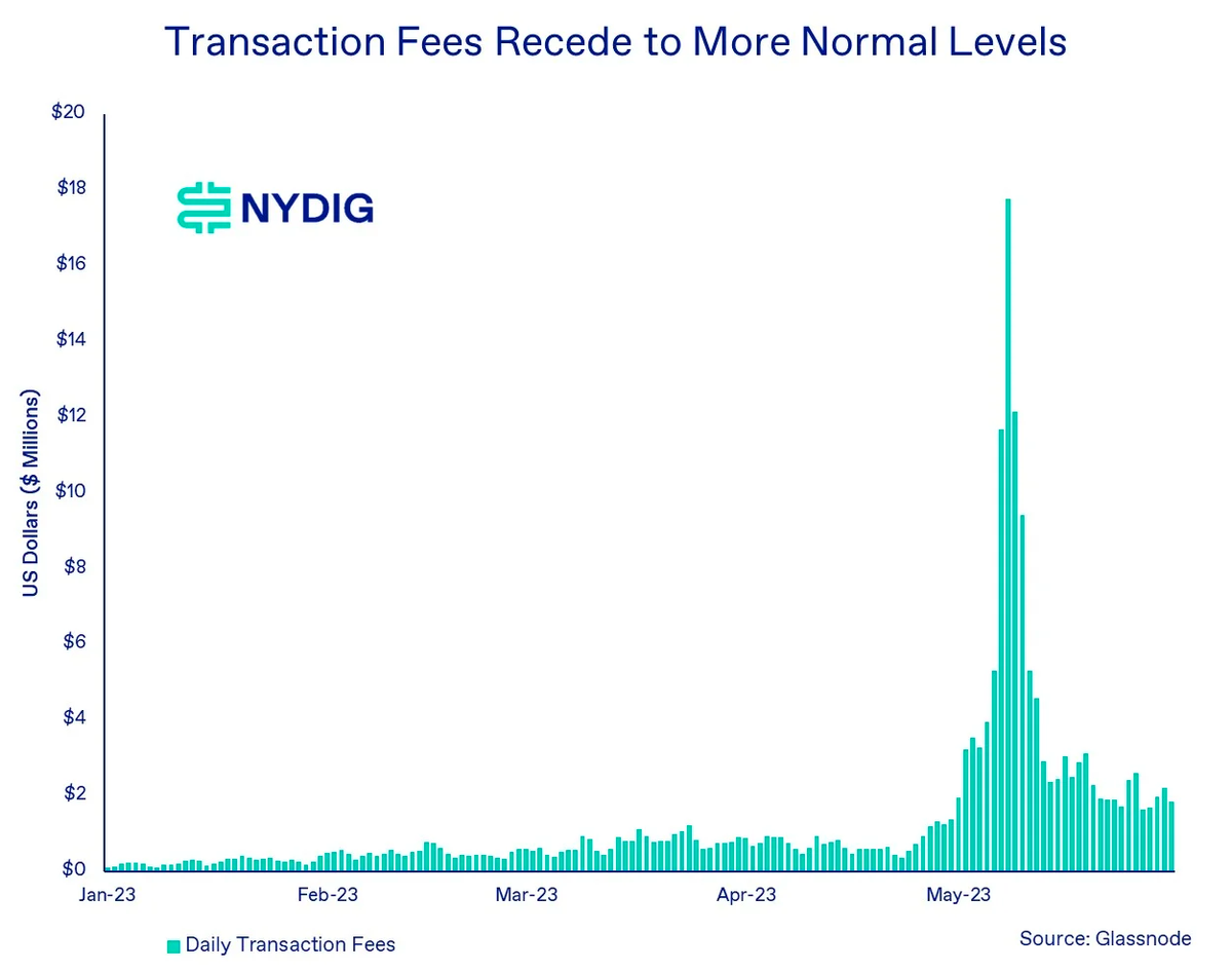 尽管当前比特币网络每天的 Gas 费仍高于 Ordinals 出现前的水平,但据我们观察,随着费率的下降,每日支付给矿工的 Gas 费用确实有所减少。无论目前的任何一种应用——不管是 BRC-20 还是 NFT 艺术——是否具有持久生命力,我们很清楚,Ordinals 开辟的设计空间已经释放了围绕比特币建设的创造性能量,这一点已经多年没有出现过了。