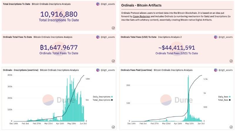 根据用户 dgtl_assets 创建的 Dune 仪表板,WEEX 注意到,截至目前,比特币网络已经有 10,916,880 个铭文向矿工支付了近 1,648 BTC(超过 44,41 万美元)的费用。