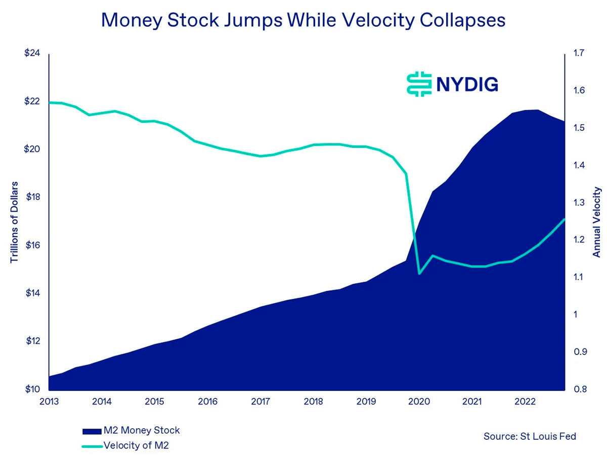 谁应该为这种状态改变负责?我们的猜测是,由于全球央行(货币刺激)和政府(财政刺激)的刺激行动,全球货币供应量激增。那段时间,不但 M2 货币供应量显著增加,货币流通也是无序的。换句话说,当时增发的大部分货币可能都涌入了金融资产(比特币、股票、债券、黄金等)和资本投资(房屋),而不是用于推动 GDP 的商品和服务消费。自然地,将这些资金一次性全部投入金融市场的结果就是,提升这些资产类别之间的相关性,其中包括比特币与股票的相关性。