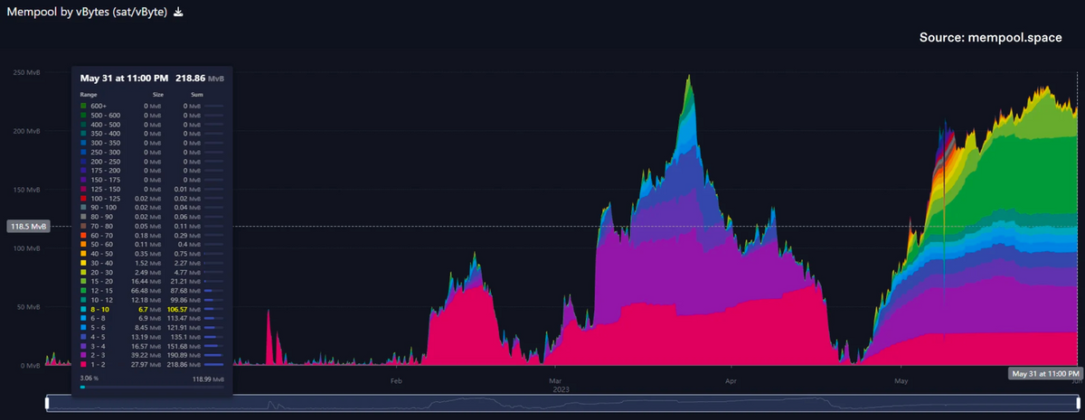 比特币的内存池,即等待矿工打包进区块的交易积压,继续徘徊在 Ordinals 和 BRC-20 引发的高点附近。然而,由于对交易即时性的需求下降,费率(satoshis/vByte)开始下降。交易费率受供求市场关系的影响,区块容量(供应)上限为 4MB/区块,交易量和交易即时性等需求的增加可能导致费率上涨。