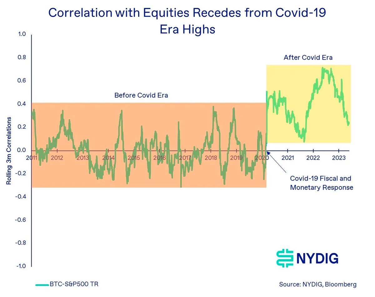 BC 时代,比特币与股票以及其他所有主要资产类别的相关性基本为零。我们关注比特币与股票(标准普尔 500 整体回报指数)的相关性,仅仅是因为大多数投资组合的风险都源于股票风险敞口,因此对投资者来说,分散投资是有利的。我们使用 3 个月的滚动相关性来证明相关性不是静态的,并且可以从波峰、波谷和平均值而不是一个长期指标中得到一些启发。