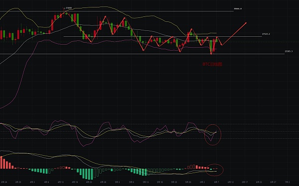 BTC短线4小时行情走势如昨日文中所料,行情在二次插针试探25300附近支撑后反弹上涨,行情走出V型反弹,目前行情承压27500下方,KDJ指标三线目前出现拐头,MACD指标红色空心动能柱放量增量,短线目前关注BOLL中轨附近支撑,日线行情6月6日K线呈实体大阳柱,并且形成一阳穿3线,6月7日K线目前呈阴K,行情目前跌破BOLL中轨一线支撑,KDJ指标三线呈金叉向上运行,MACD指标红色空心动能柱放量,日线关注上方27500一线压力,综合来看:目前行情处于6月5日和6月6日行情上下扫盘后的窄幅震荡修复阶段,行情若能继续向上突破27500附近压力,将再次向上试探30000整数关口压力,建议还是以低多为主
