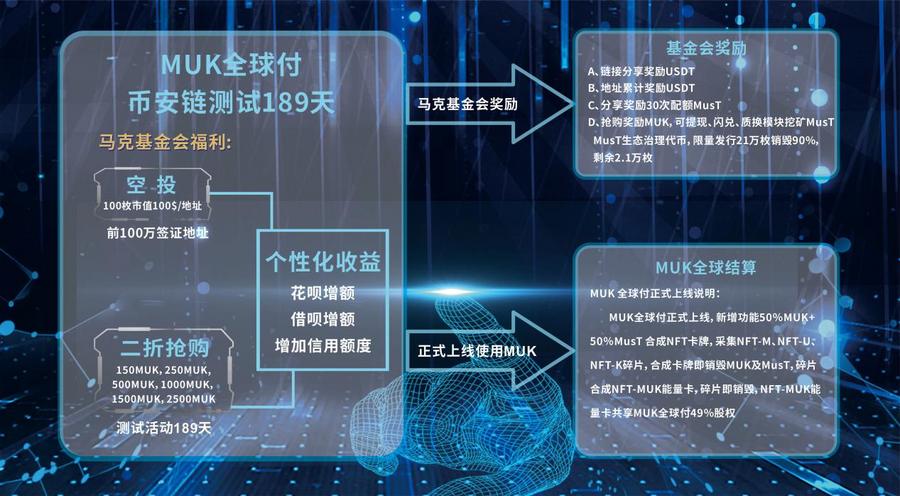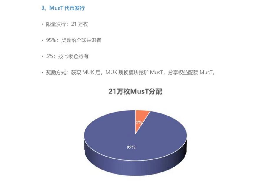 发行21万生态代币MusT,作为MUK全球付价值权益通证MusT,模型治理匹配《零存整取》,通过币安系统测试189天,成功创建第一批链上原始级股东,在测试期间原始级股东可通过平台限量抢购折扣MUK,抢占MUK全球付先期红利,所有充值U通过平台共识拉升生态代币MusT价值,直至通缩只2.1万枚MusT。