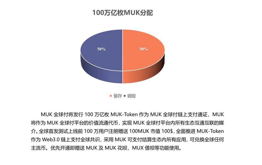 MUK全球付将发行双通政机制赋能经济生态价值、其中发行10万亿枚 MUK-Token作为MUK全球付链上支付通证,作为平台的价值流通代币,实现MUK 全球付平台内所有生态互通互联的媒介。全球首发测试上线前100万用户注册增100MUK市值100$,全面推进MUK-Token 作为Web3.0 链上支付全球共识,采用MUK可支付结算生态内所有应用,可兑换全球任何主流币。